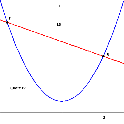 Find the equation for the line \(L\) (graphed in red) in the figure below. Note the \(x\)-coordinate of the point \(Q\) is 2, \(y\)-coordinate of the point \(P\) is 13, and the parabola (graphed in blue) has equation \(y = x^2 + 2\text{.}\)