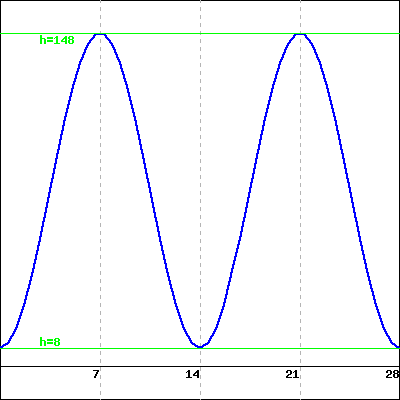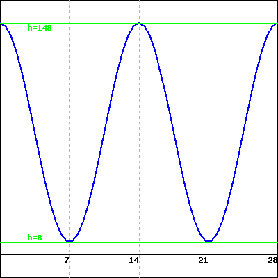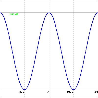 A ferris wheel is 140 meters in diameter and boarded at its lowest point (6 O’Clock) from a platform which is 8 meters above ground. The wheel makes one full rotation every 14 minutes, and at time \(t = 0\) you are at the loading platform (6 O’Clock). Let \(h = f(t)\) denote your height above ground in meters after \(t\) minutes.