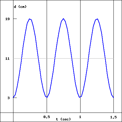 A weight is suspended from the ceiling by a spring. Let \(d\) be the distance in centimeters from the ceiling to the weight. When the weight is motionless, \(d = 11 \, \mbox{cm}\text{.}\) If the weight is disturbed, it begins to bob up and down, or oscillate. Then \(d\) is a periodic function of \(t\text{,}\) the time in seconds, so \(d = f(t)\text{.}\) Consider the graph of \(d = f(t)\) below, which represents the distance of the weight from the ceiling at time \(t\text{.}\)