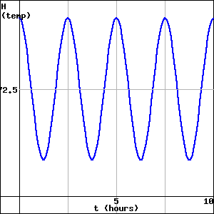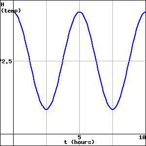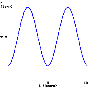 The temperature of a chemical reaction oscillates between a low of \(10 \ {}^\circ C\) and a high of \(135 \ {}^\circ C\text{.}\) The temperature is at its lowest point at time \(t = 0\text{,}\) and reaches its maximum point over a two and a half hour period. It then takes the same amount of time to return back to its initial temperature. Let \(y = H(t)\) denote the temperature of the reaction \(t\) hours after the reaction begins.