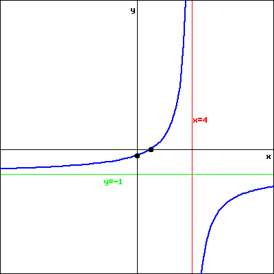 Find a possible formula for the function graphed below. The \(x\)-intercept is marked with a point located at \((1, 0)\text{,}\) and the \(y\)-intercept is marked with a point located at \((0, -0.25)\text{.}\) The asymptotes are \(y = -1\) and \(x = 4\text{.}\) Give your formula as a reduced rational function.