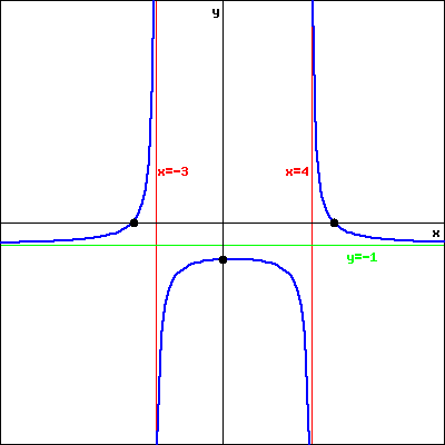 Find a possible formula for the function graphed below. The \(x\)-intercepts are marked with points located at \((5, 0)\) and \((-4, 0)\text{,}\) while the \(y\)-intercept is marked with a point located at \(\left( 0, -\frac{5}{3} \right)\text{.}\) The asymptotes are \(y = -1\text{,}\)\(x = -3\text{,}\) and \(x = 4\text{.}\) Give your formula as a reduced rational function.