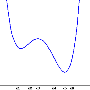 At exactly two of the labeled points in the figure below, which shows a function \(f\text{,}\) the derivative \(f'\) is zero; the second derivative \(f''\) is not zero at any of the labeled points. Select the correct signs for each of \(f\text{,}\)\(f'\) and \(f''\) at each marked point.
