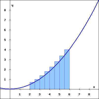 The rectangles in the graph below illustrate a left endpoint Riemann sum for \(\displaystyle f(x) = \frac{x^{2}}{9}\) on the interval \(\lbrack 2, 6 \rbrack\text{.}\)