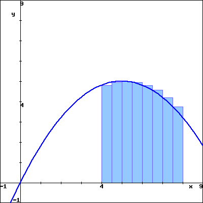The rectangles in the graph below illustrate a left endpoint Riemann sum for \(\displaystyle f(x) = \frac{-x^{2}}{5}+2x\) on the interval \(\lbrack 4, 8 \rbrack\text{.}\)