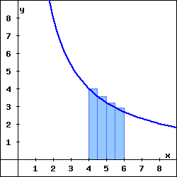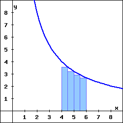 (b) The rectangles in the graph above illustrate a right endpoint Riemann sum for \(f(x)\) on the interval \(4 \leq x \leq 6\text{.}\) The value of this right endpoint Riemann sum is , and it is an