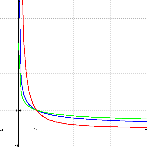 Given the function \(\displaystyle f(x)= \frac{1}{x^{1/2}}\) (in blue), consider the functions \(g\) (in green) and \(h\) (in red) graphed below which are continuous on \((0, \infty)\text{.}\) Assuming the graphs continues in the same way as \(x\) goes to infinity, answer the following questions.